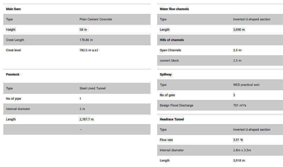 The main works include: auxiliary dam, water supply tunnel, main dam, diversion tunnel, pressure tank, penstock and power plant. The main dam is a roller compacted concrete dam, 58 meters high with dam crest length of 178 meters.