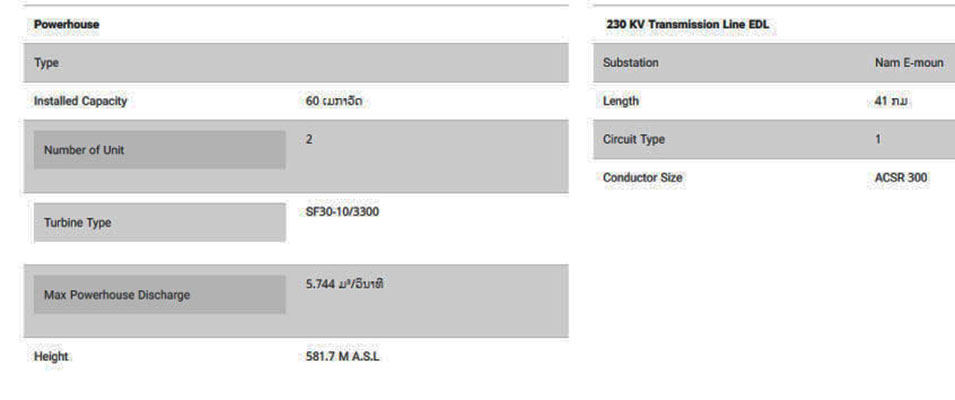The Houay La Ngae project output is planned to be exported to the Vietnam national grid as seen in the map below. Output is to be first connected to the Nam-Emoun transformer station via a 41 km-long 220 kV line, then transmitted via a 51 km-long line to the border and finally along a 13.4 km long line in Vietnam to the 220 kV Dak Ooc switching station in Nam Giang district, Quang Nam province, Vietnam. Click to see a larger scale export map HERE.