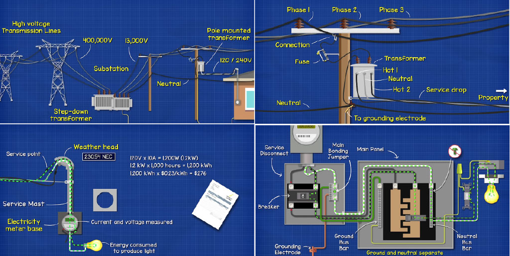 Example diagrams of 3-phase electricity supply wiring below in USA: