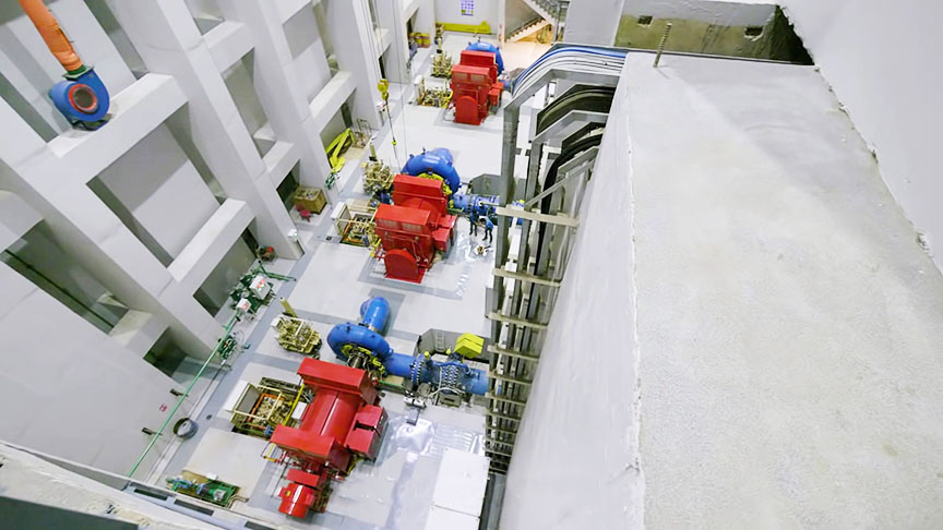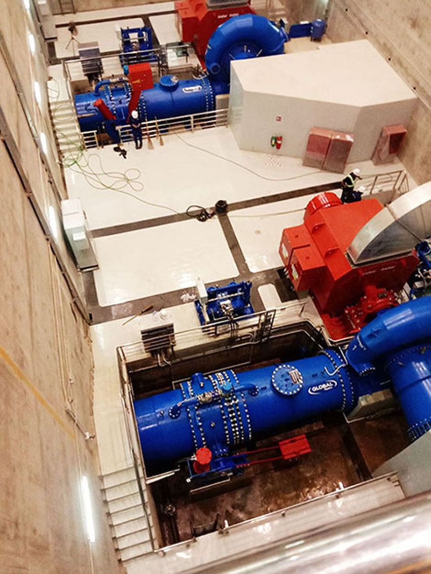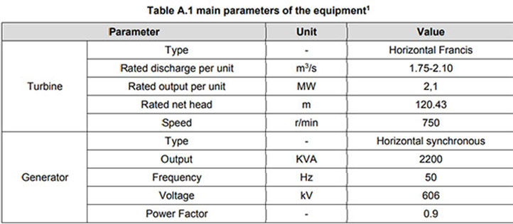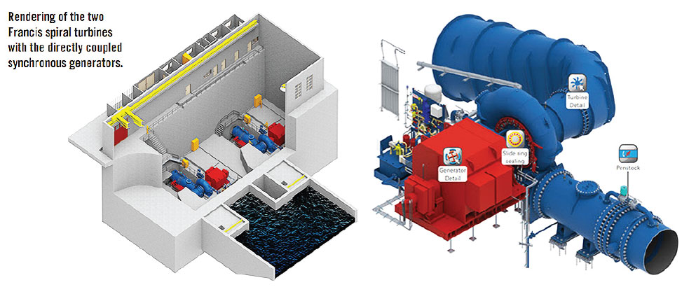 3 horizontal Francis spiral turbine-generator sets rated at 6.7 MW output each for 20.1 MW total capacity.