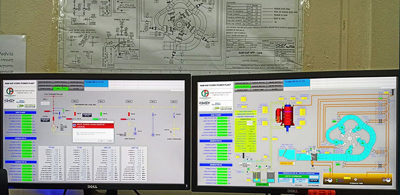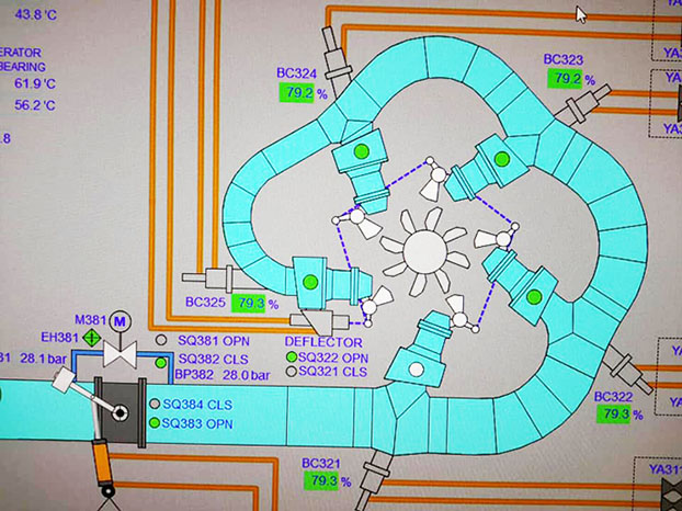 SCADA screen below for hydropower plant - system is used for monitoring and controlling various processes from remote areas in a hydropower plant. It allows an operator to make changes on remote controllers, to open/close valves/switches, to monitor alarms and to gather instrument information.