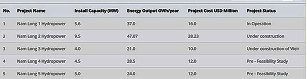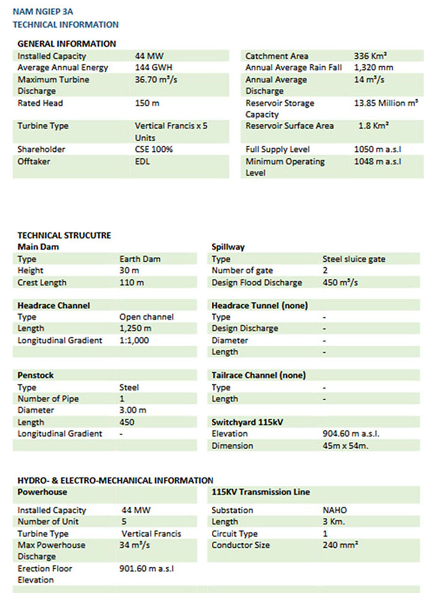 Nam Kong 3 Hydro Power Project has head of 96 meters with three compact vertical axis Francis turbines of 18 MW each for a combined capacity of 54 MW below;