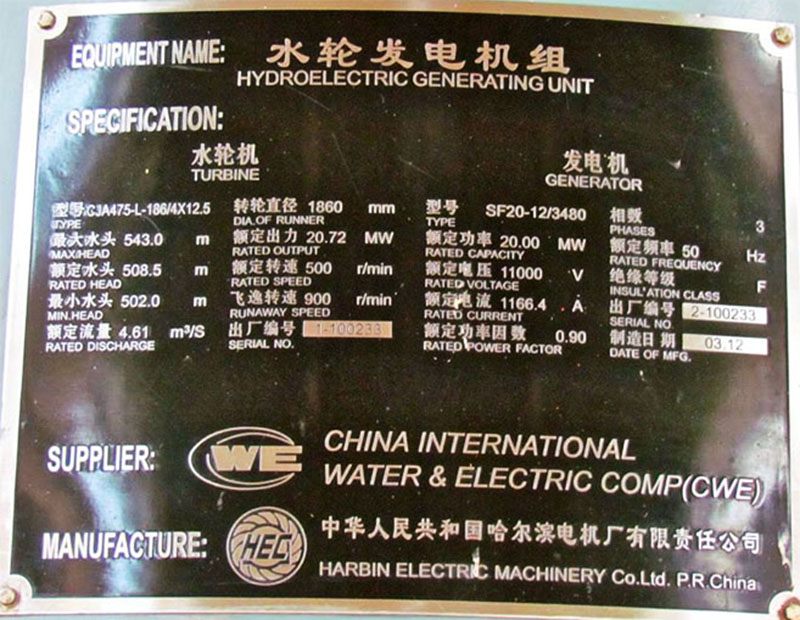 Sample Hydraulic Turbine-Generator set nameplate image below: