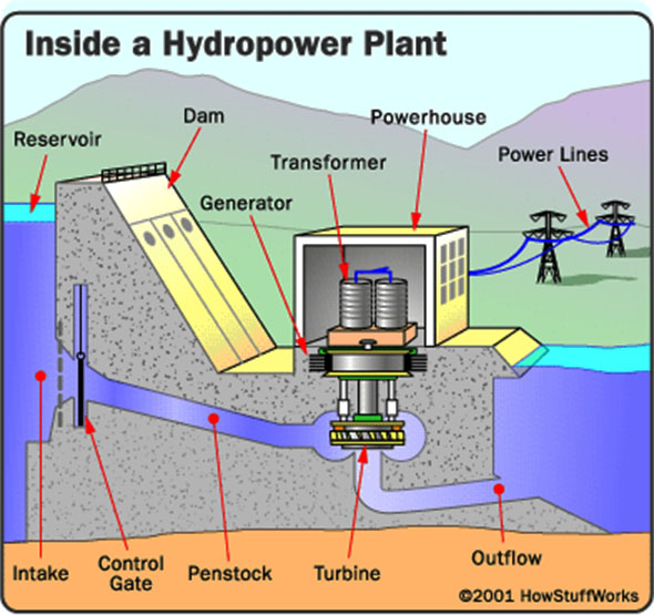 Sunshine and Gravity do the Work - Sunshine transfers energy from the sun to heat water in our oceans and other water bodies causing evaporation that transfers energy into water vapor in clouds. When water vapor condenses and rain falls on mountains some of that energy is transferred to water in rivers and lakes. As that water flows naturally by gravity to lower levels it releases some of that energy on the way down. A body of water at a higher elevation has more kinetic energy (potential energy) stored in it than a similar body of water at a lower level. We can capture some of the energy released on the way down by placing turbine blades into the downward flow which spins the blades and a rod connected to a generator with magnets. This induces or creates an electrical current that can be transported by electric transmission lines to places far away. Once a hydroelectric system is in operation the ongoing costs are low making the whole process quite efficient. Sunshine, rain and gravity are free.