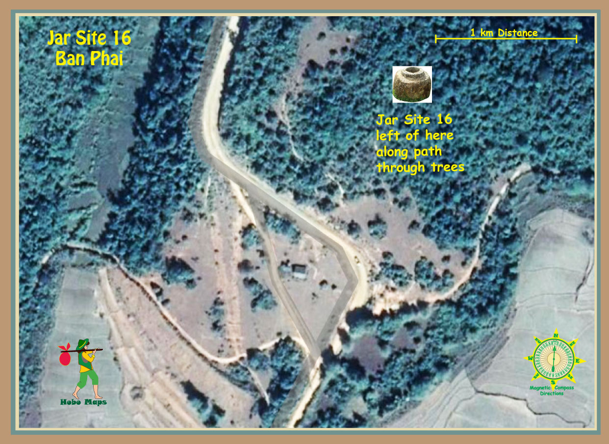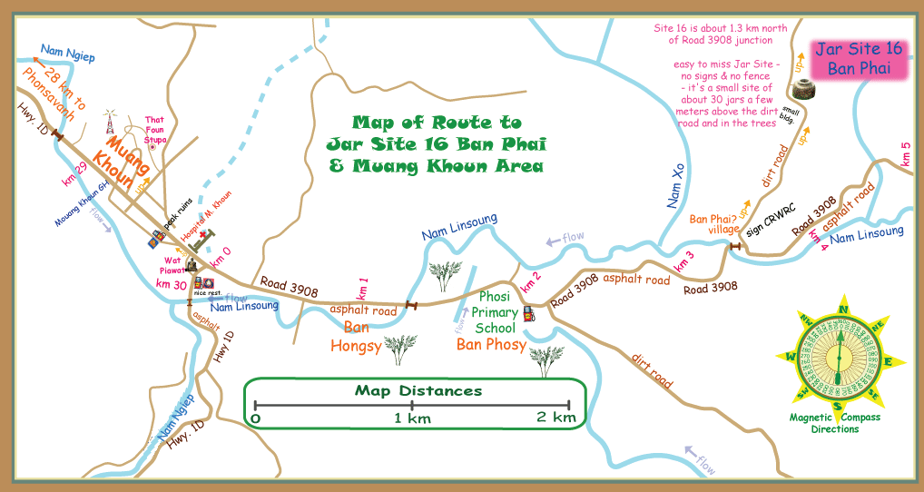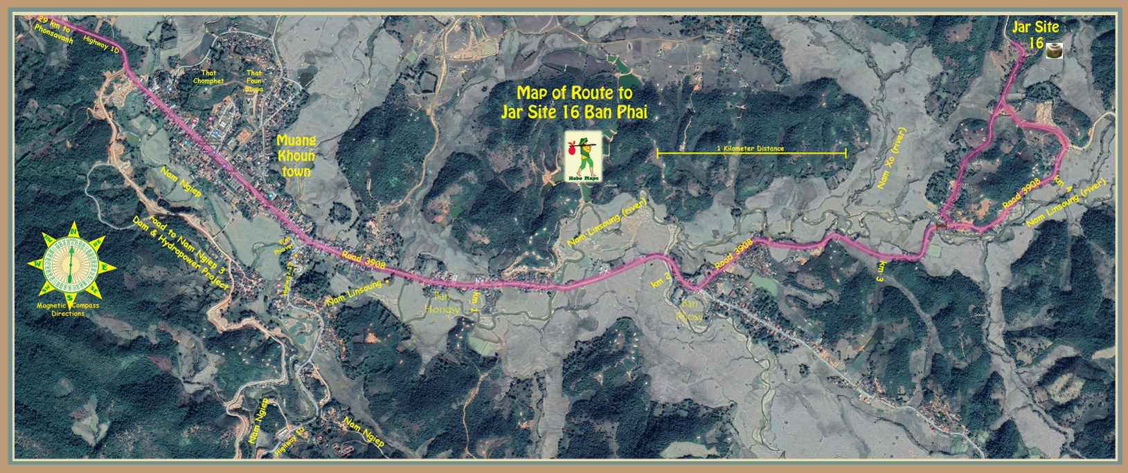 The maps below show the route to get to Jar Site 16 Ban Phai from Muang Khoun the old Phuan capital which is about 30 km southeast of Phonsavanh via Highway 1D.