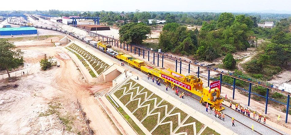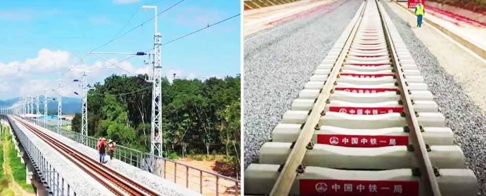 The Lao-China Railway project had most of its steel rails manufactured in 100 meter lengths. Normally, five of these rails are welded together at a special facility near the railway construction site into 500-meter-length rails that are then transported by rail cars to the final location and drag-dropped along the sides of the railway bed. After the concrete ‣sleeper” ties are placed and positioned on the ballast bed these 500-meter rails are then lifted and moved into position on top of the ties by a rail-laying machine (see images below). Additional final welding at the job site welds these 500-meter rails together into a seamless continuous rail without joints, known as a continuous welded rail (CWR).