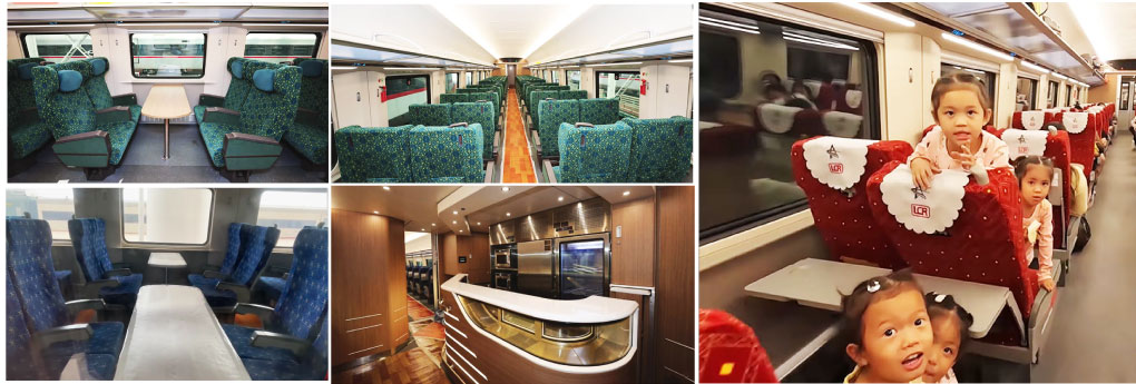 Fast Trains have 9 carriages - the control car with Business Class seats, a dining car, a first class car with 62 seats and 6 second class coaches. There are about 720 air conditioned seats total. Each seat has an electrical power outlet for use by passengers.