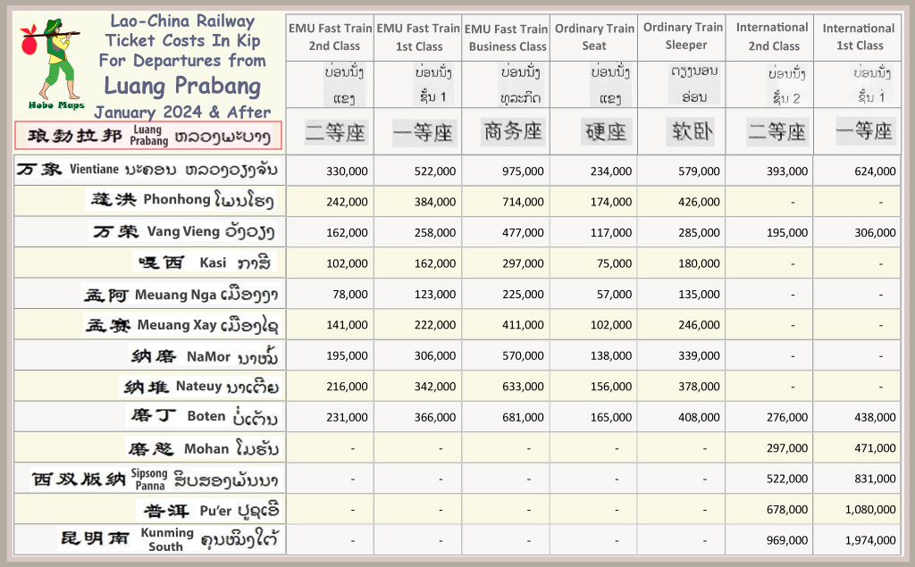 Charts below show ticket costs for trains departing from Vientiane & Luang Prabang in January 2024 & same fares in May 2025. Excludes agent fees and extra 20,000 kip charged when using App or buying at ticket offices not at railway station. See our other web page for more fares charts HERE.