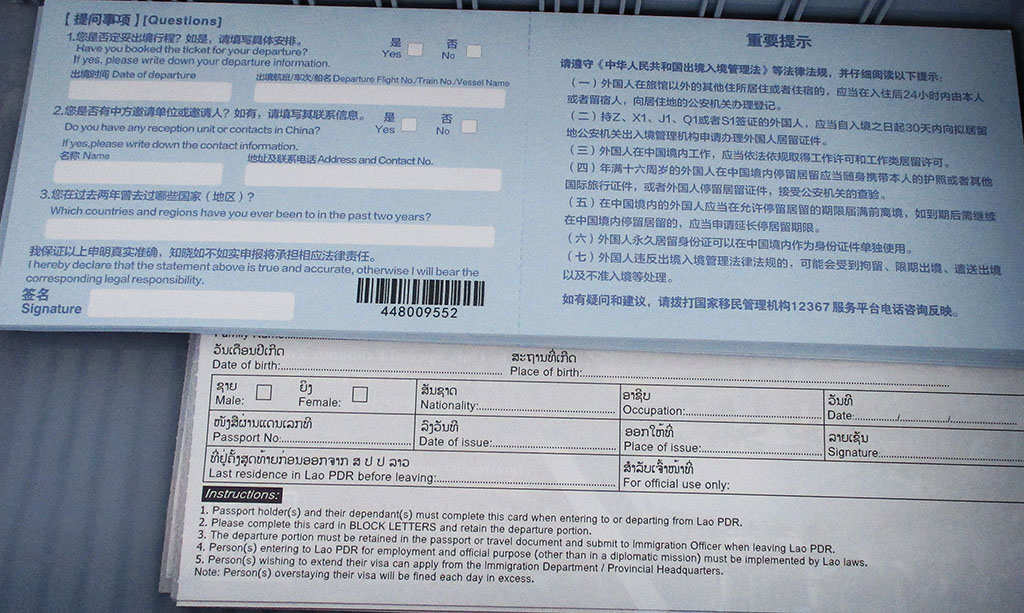 Railway immigration forms images below for international travel between Laos and China that passengers must complete at the departure station in Laos before starting their trip. Required info includes departure info, contacts in China and countries and regions the passenger has visited in the prior two years,