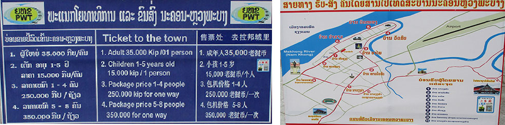 Minivan transport from Luang Prabang Railway Station to central town signs below in June 2023. Very reasonable prices for drop-off at destination that passenger chooses.