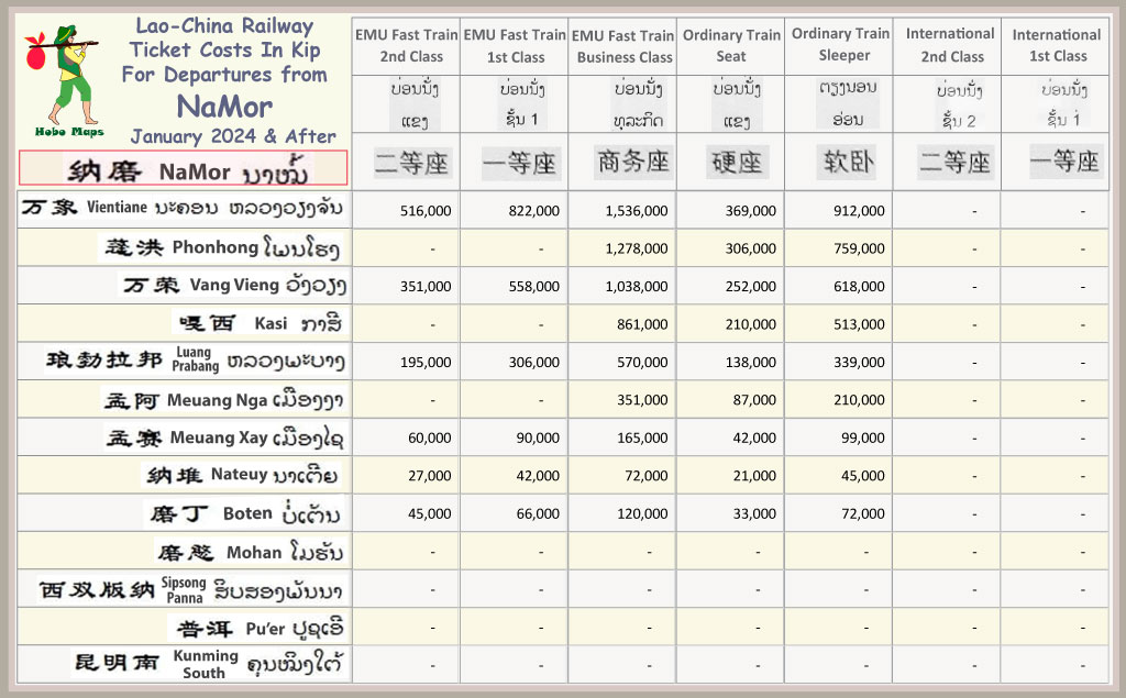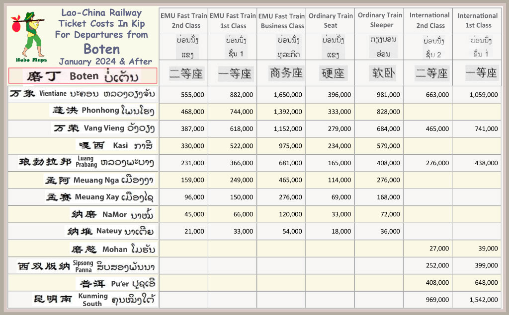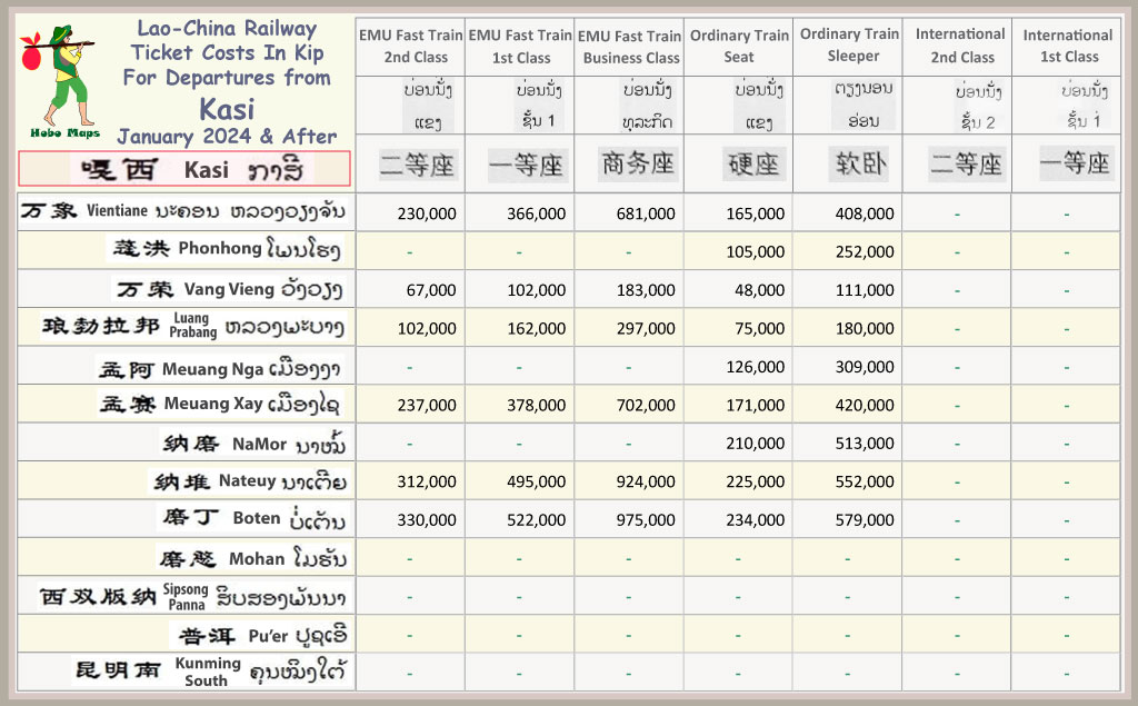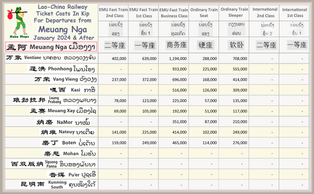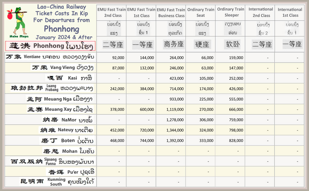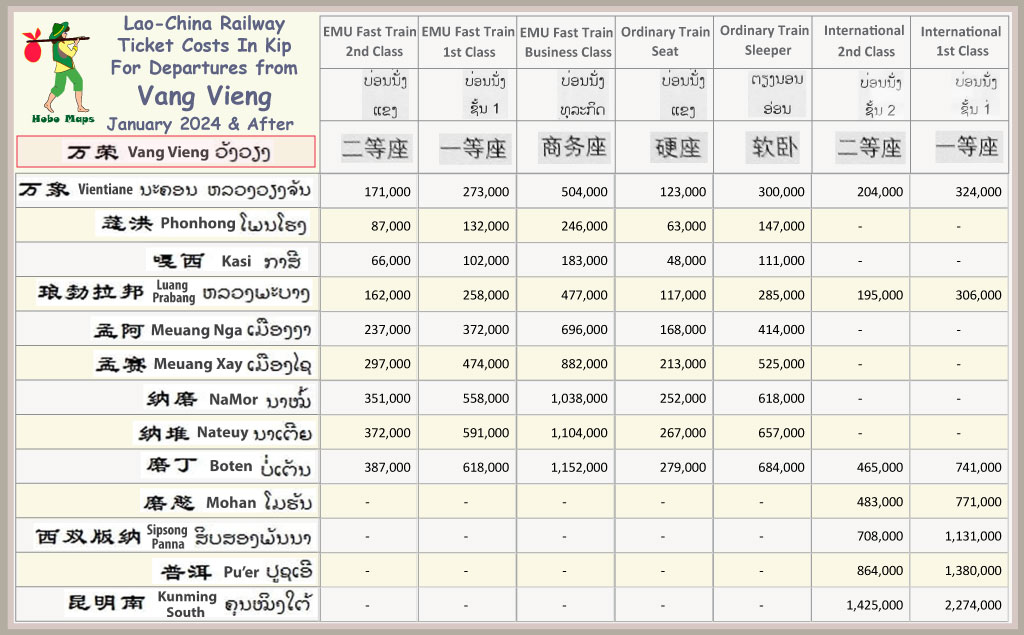 Charts below show railway ticket fares for all 10 passenger stations in Laos. Each schedule shows departures from one station only for simplicity. Stations are arranged below from south to north - Vientiane, Phonhong, Vang Vieng, Kasi, Luang Prabang, Meuang Nga, Meuang Xay, NaMor, Nateuy & Boten.
