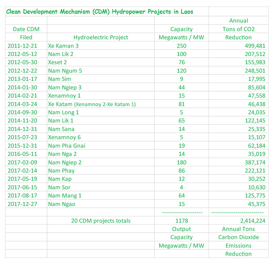 This web page summarizes the hydropower projects in Laos that have qualified as Clean Development Mechanism (CDM) projects under the Kyoto Protocol and are able to receive carbon reduction credits since their operations may result in reduction of overall greenhouse gas emissions.