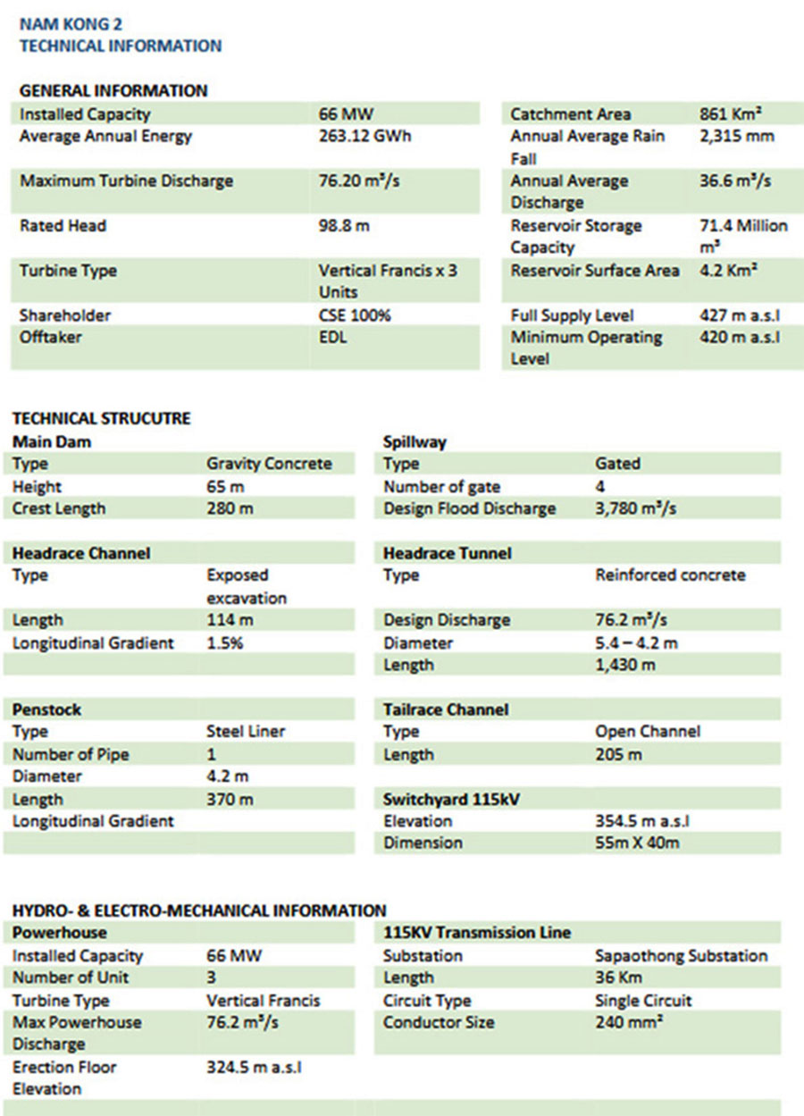 Nam Kong 2 hydropower project has 3 units of Francis turbines at 22 MW each for a total installed capacity of 66 MW with annual generating capacity of 263 GWh.