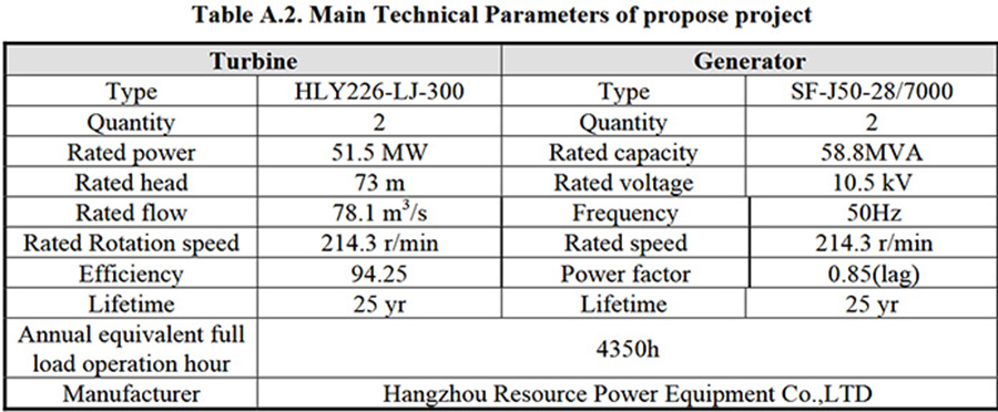 The project includes a dam, reservoir, diversion system, powerhouse and transmission system. The installed capacity of the project is 100 MW with annual power generation capacity of 435 GWh. The project is equipped with two 50 MW Francis turbines coupled with 58 MVA generators provided by Hangzhou Resource Power Equipment Company that have a predicted lifespan of 25 years.