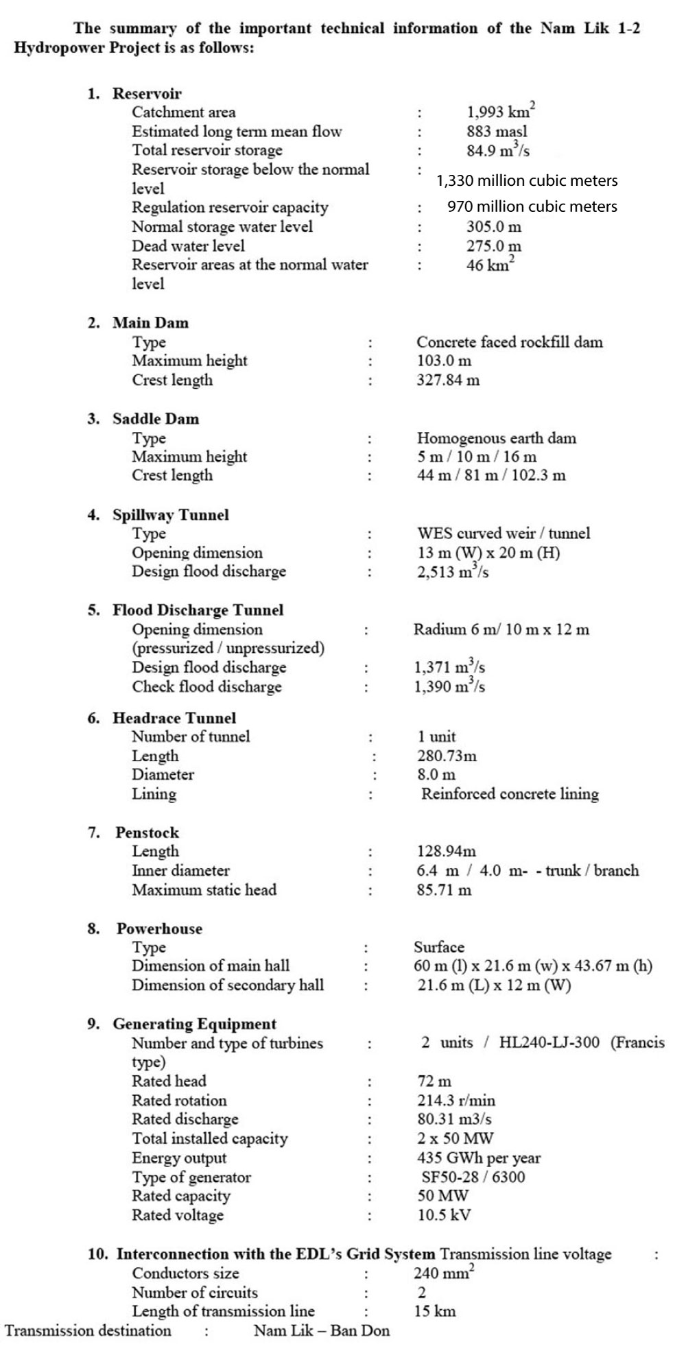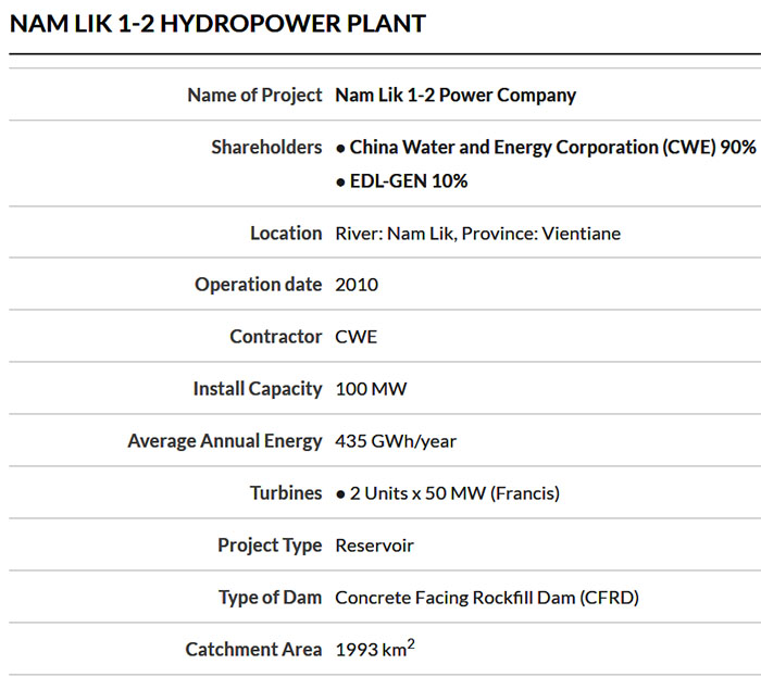 Technical information for the Nam Lik 2 Hydropower Project below: