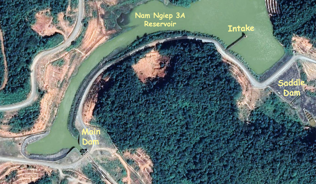 Tthe Nam Ngiep river below the dam seems dry in the satellite image so the intake structure must be taking nearly all of the outflow from the reservoir into an underground conduit to the Nam Ngiep 3A powerhouse.