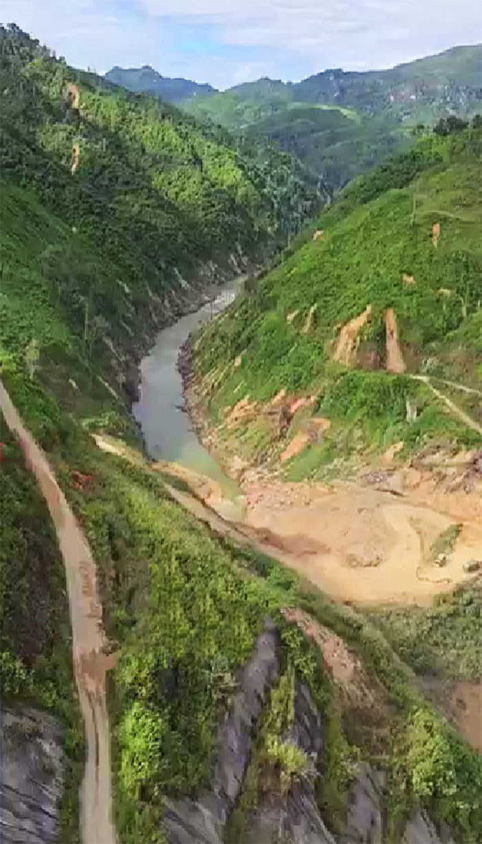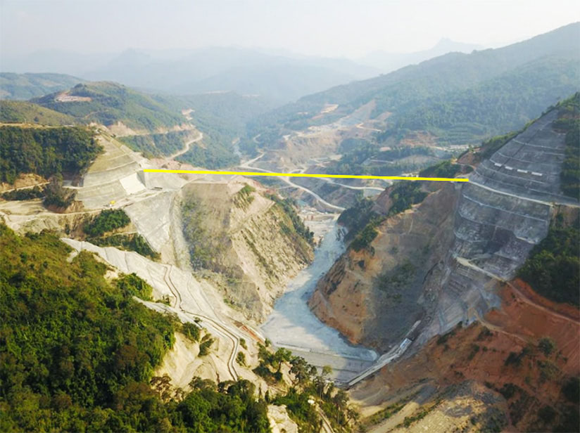 Steep and deep valley behind Nam Ngum 3 Dam below. The yellow line might represent Full Supply Level of the reservoir or the top of the dam structure.