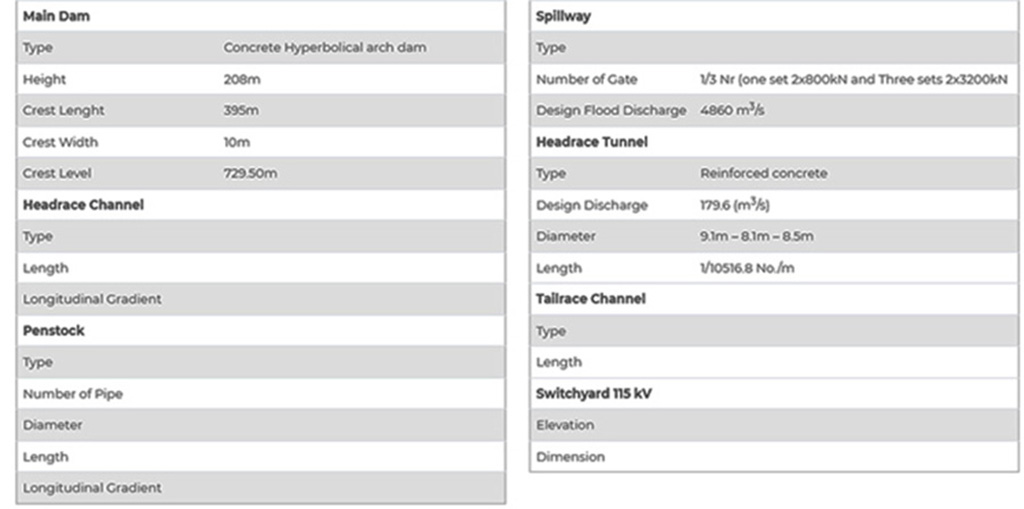 The water diversion system includes a 10.5 km-long reinforced concrete headrace tunnel 9.5 meters in diameter, a 240 meter-high surge shaft with an inner diameter of 15 meters and a 1,623 meter-long pressure shaft.