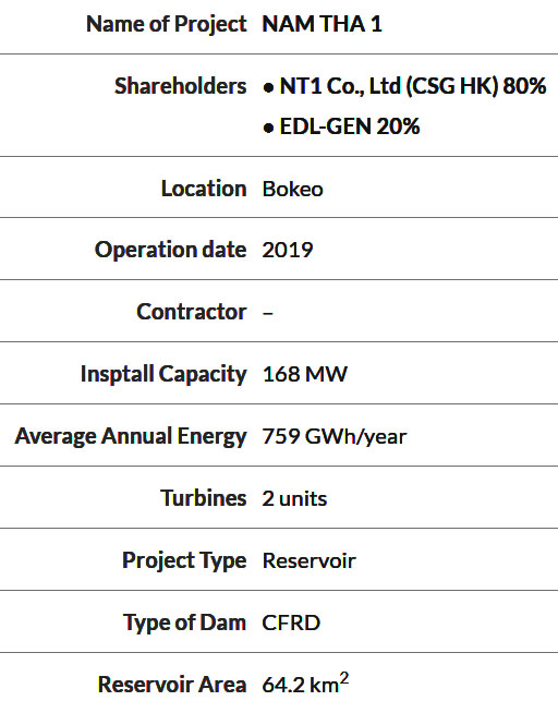 Nam Tha 1 Lao Power Co. Ltd., is the legal owner of the project with China Southern Power Grid International as 80% shareholder and Electricite du Laos (EDL) as 20% shareholder. The project operates under a 28 year build-operate-transfer (BOT) concession agreement.