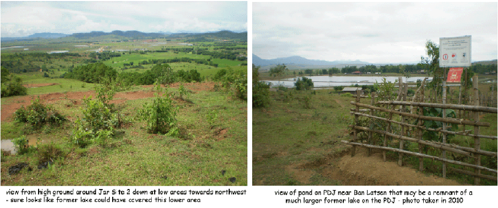 Topographic observations of the Xieng Khouang Plateau at the Plain of Jars indicate a flat, open plain interspersed with gentle depressions and surrounding upland ridges. Such geomorphological characteristics are consistent with the presence of a former lake. Satellite imagery supports the idea that water may have once poolcollected across this plateau, creating a shallow lake environment