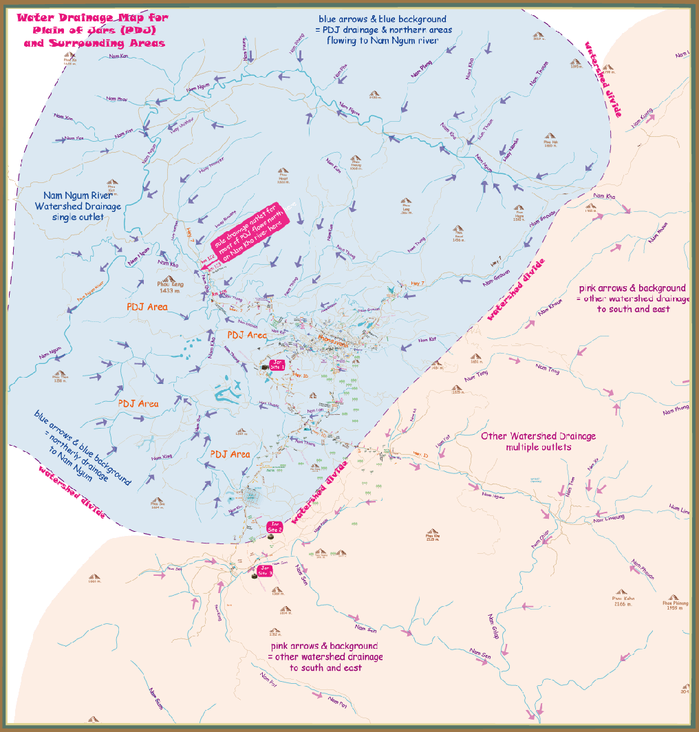 The map below shows the water drainage system for the entire area around the Plain of Jars (which is at the lower part of the blue-colored area)