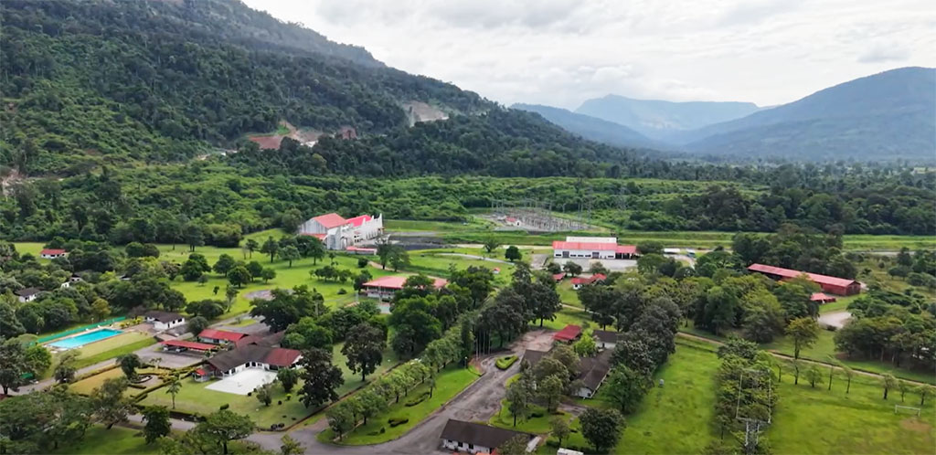 A weir style dam (sometimes called Kengbith Dam) holds back water in a head pond on the Nam Theun (river). Two underground tunnels carry water from the head pond down 240 meters in elevation to a power station located in Na Hin town far below in the Khounkham valley.