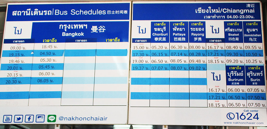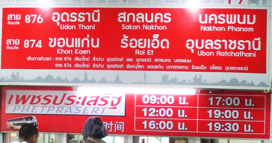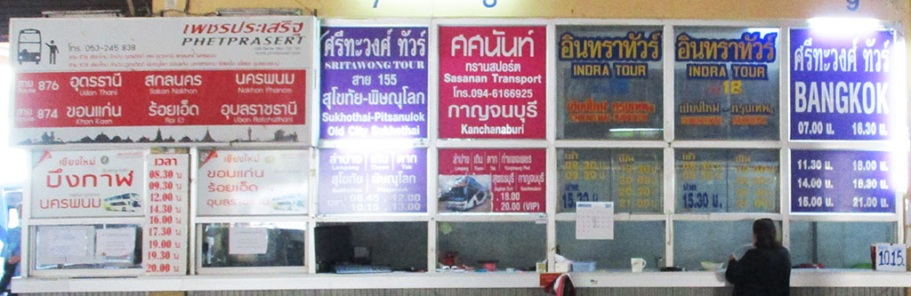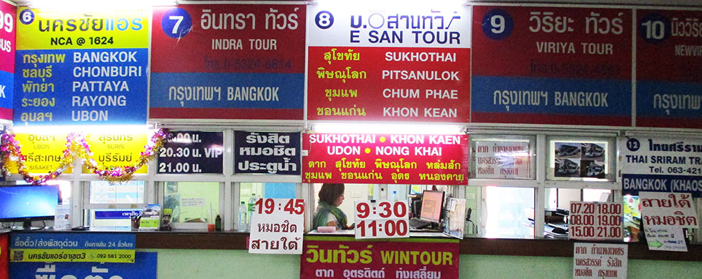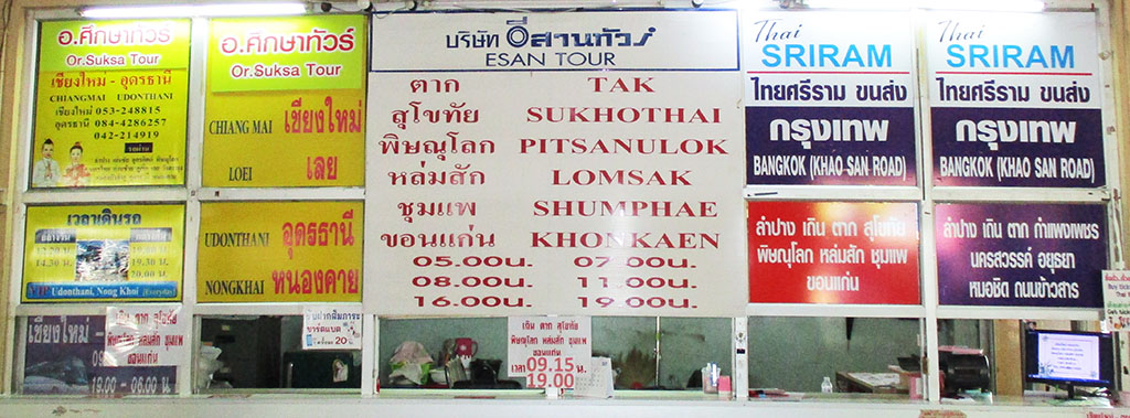 Udon Thani - Only 2 or 3 bus companies have direct routes to Udon Thani via Phitsanulok with only one daytime bus (Phetprasert) while the others go at night departing around 19:00 to 21:00 daily. Takes about 11 hours at night and longer for daytime. All these buses depart from Arcade Bus Stations 2 & 3 and most sell tickets in advance the day before departure. Nok Air has flights to Udon Thani at low rates.