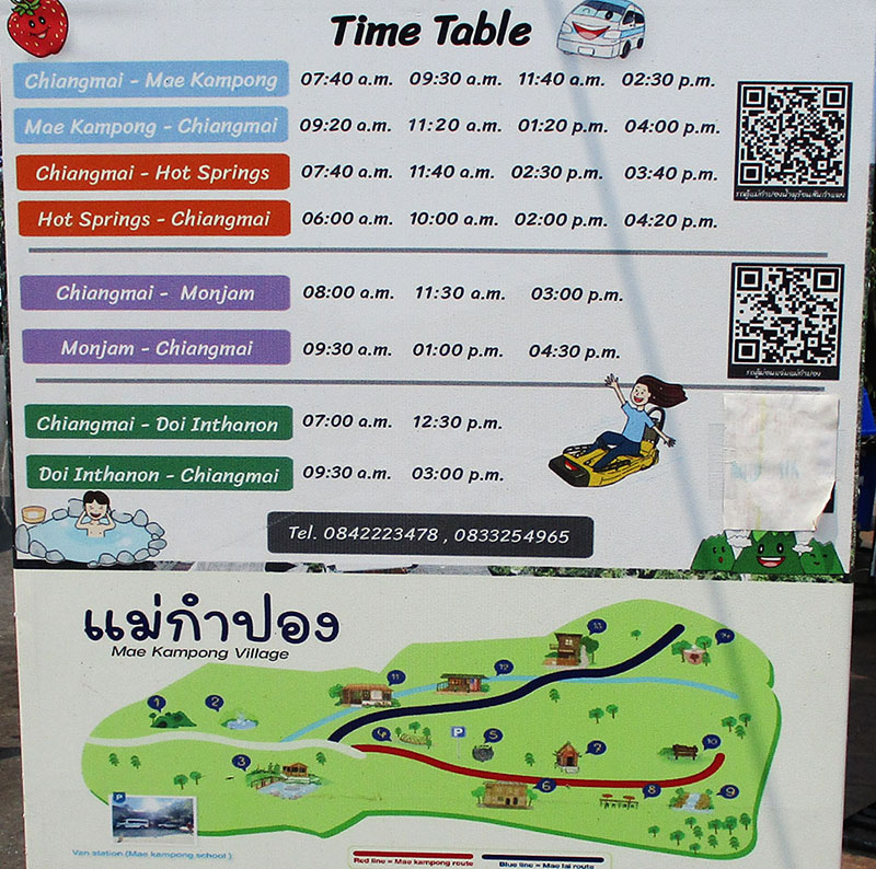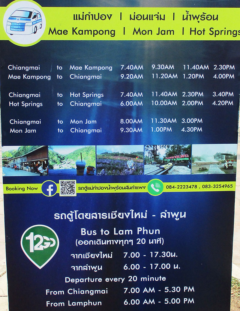 San Kamphaeng - white songtaew buses go from Warorot Market to San Kamphaeng. Monjam (Mon Cham) is near Mae Rim north of Chiang Mai. See schedules below.