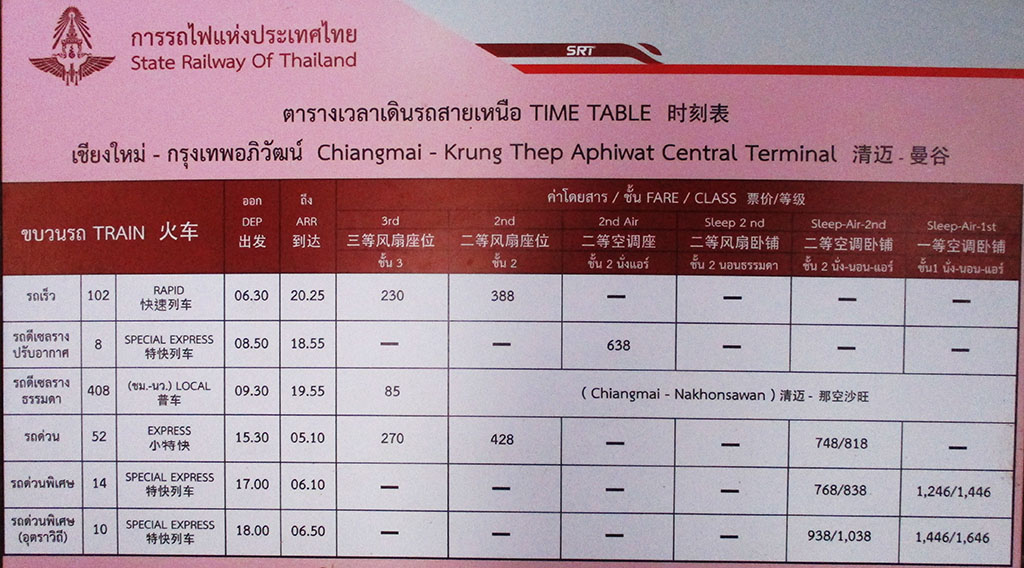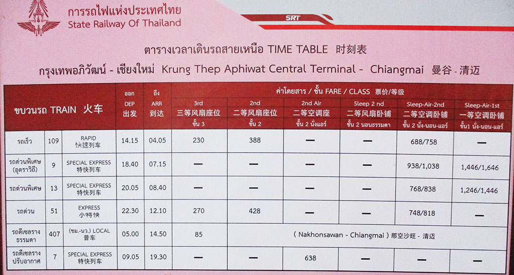 Schedule below shows trains from Bangkok to Chiang Mai - picture taken November 2024
