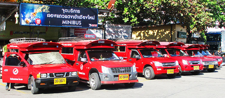 Many songtaew buses (pickup style with benches in back) and tuk tuks go around town. Just stand by the road most anywhere and wave your hand in a downward motion to flag them down. Songtaews will take you to a specific location but may use a long route while picking up and dropping off other passengers. The problem is getting the driver to know where you want to go as most don't speak English. Many visitors today have a mobile device app that shows drivers in Thai where they want to go.