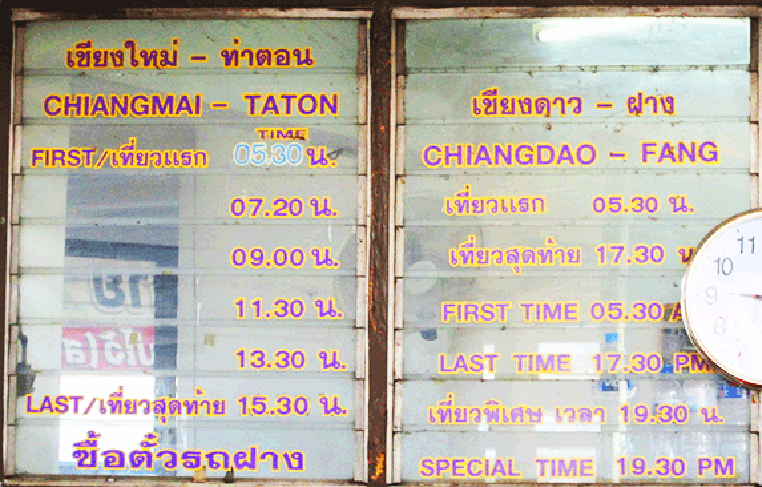 NORTH: Chiang Dao, Fang & Thaton - big orange buses go from Chang Puak Bus Station to Chiang Dao, Fang and Tha Ton. Yellow songtaews go to Mae Rim.