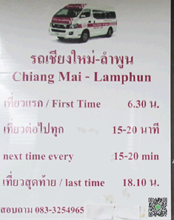 Lamphun - blue songtaew buses go from Warorot Market to Lamphun. Minivans also go from Chang Puak Bus Station. Many big buses on way south from C. Mai stop in Lamphun.