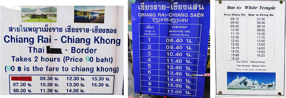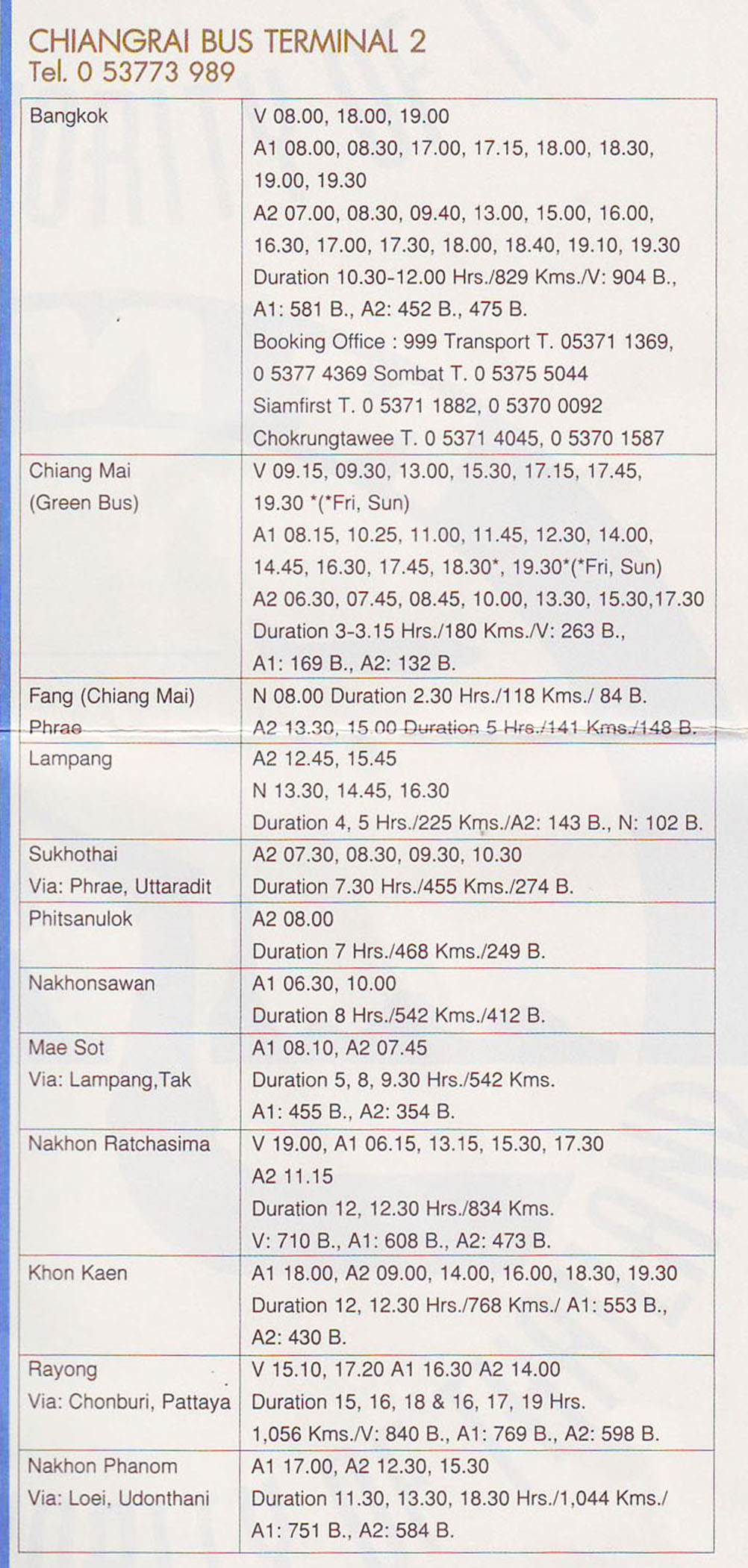Bus Schedules below from C. Rai Tourism Office Dec. 2015 - Terminal 1 is in central town and Terminal 2 is outer area terminal. In Feb. 2024 we asked the Thai tourism office at Chiang Rai bus station for a bus schedule update but they said the system is "not stable" and at the whim of bus drivers and companies. The 2015 schedule below is still a rough guide of where buses go and about how often.
