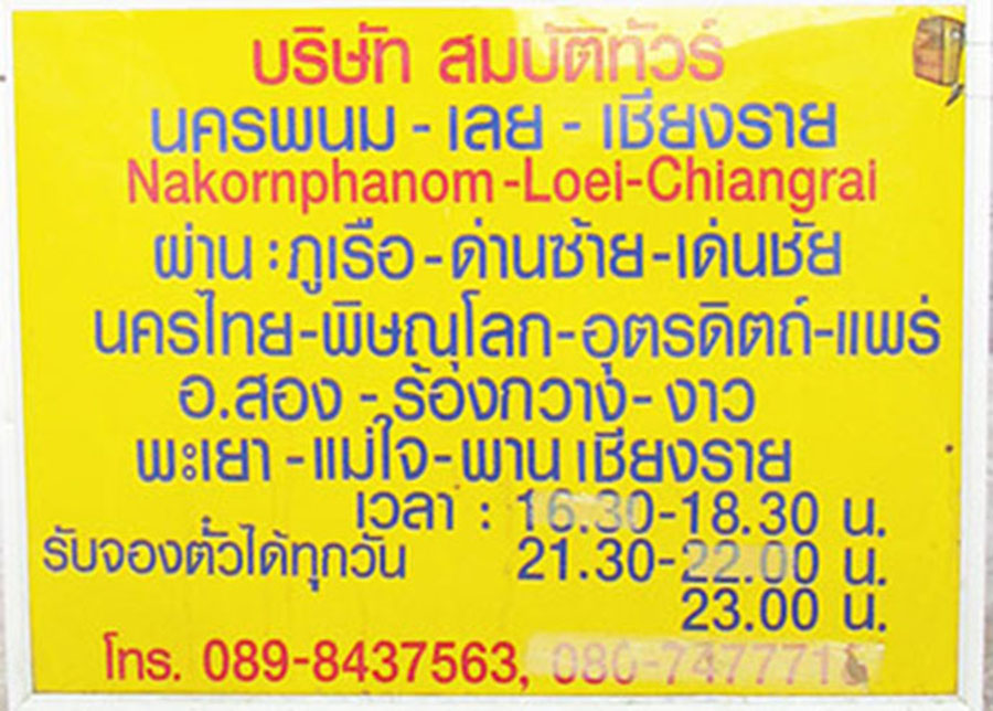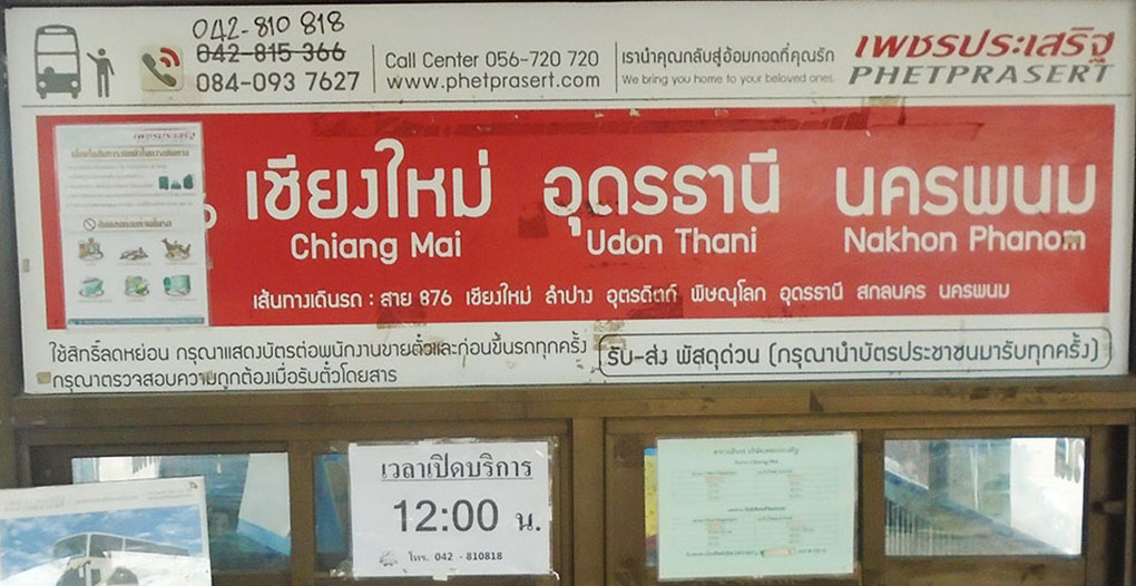 From Chiang Mai to Loei - Their daytime bus starts in Chiang Mai at 09:30 and arrives in Loei around 19:30. It has stops along the way in Lamphun, Lampang, Uttaradit, Phitsanulok, Dan Sai and Phu Reua. Their 20:00-21:00 night buses stop in Loei around 04:00 on the way to Udon Thani and Nakhon Phanom and Bueng Kan.