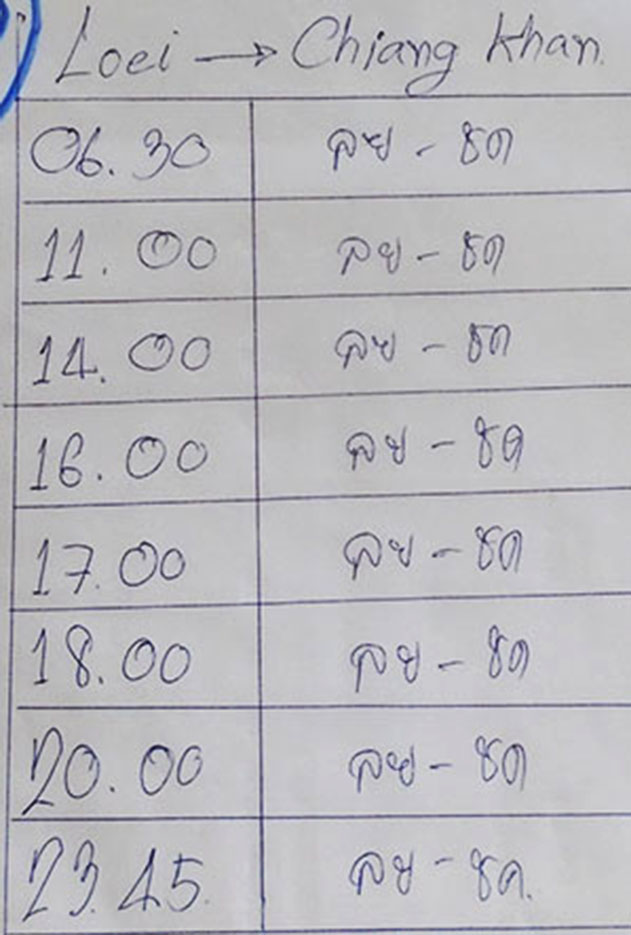 Chiang Khan departure schedule below at Nakhon Chai Company bus station August 2019 for air con big buses