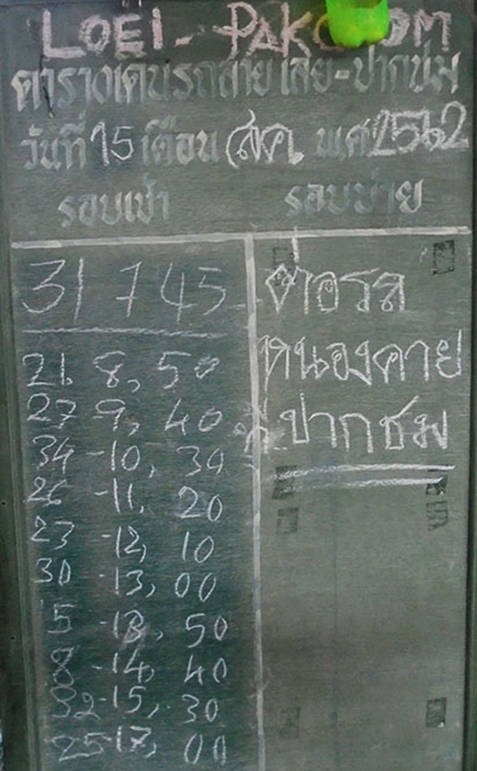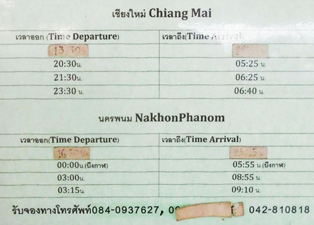 Phetprasert bus schedule below shows departure times from Loei going to C. Mai and Nakhon Phanom - August 2019 picture