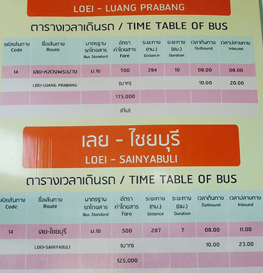 International Bus Station is located at the Loei Bus Station in a separate building and has buses to Luang Prabang and Sainyabouli, Laos (Sayaboury) departing at 08:00 daily. The bus stops at the Lao border near Tha Li where passengers go thru immigration and customs. The trip to Luang Prabang takes about 9 hours in a big air conditioned bus on a decent paved road (Hwy. 4) almost entirely in Laos. In March our bus from Loei arrived in Sayabouri at 15:10 PM = 7 hrs 10 minutes trip. A great bus trip. The August 2019 schedule and cost is below: