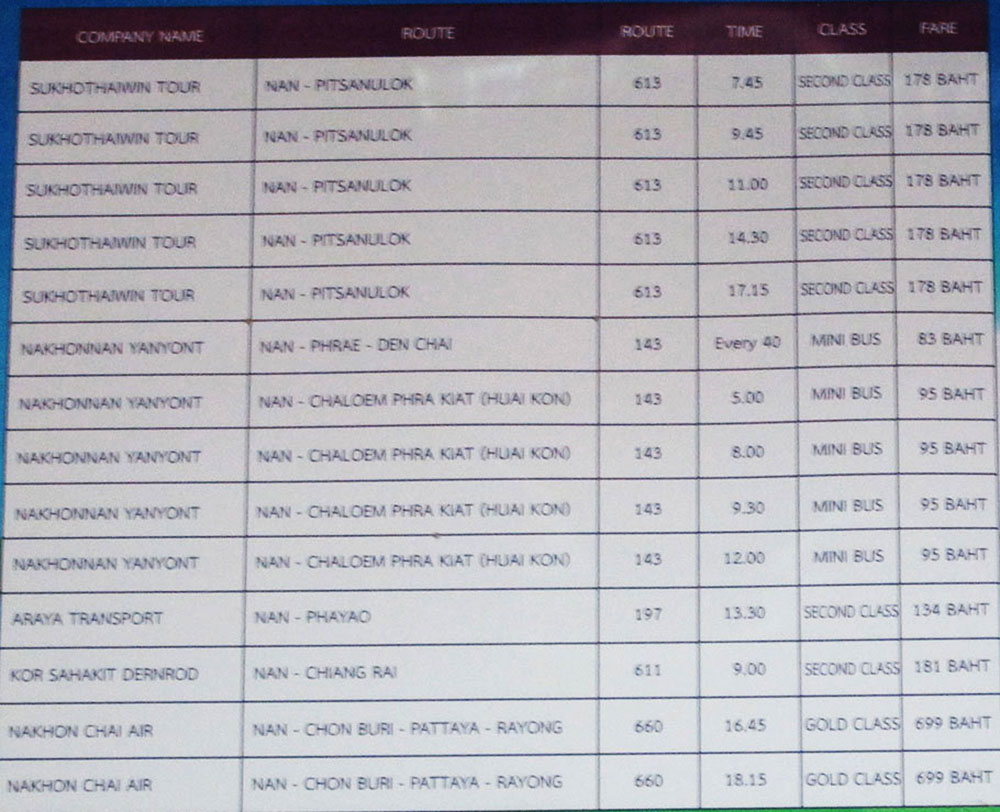 We were told of the following bus schedule departures from Nan Bus Station. Since these schedules were verbal replies to our questions and were not seen on signs the info is incomplete. For some places such as Pua they have big old slow orange buses and light blue songtaew buses going so there is an option.