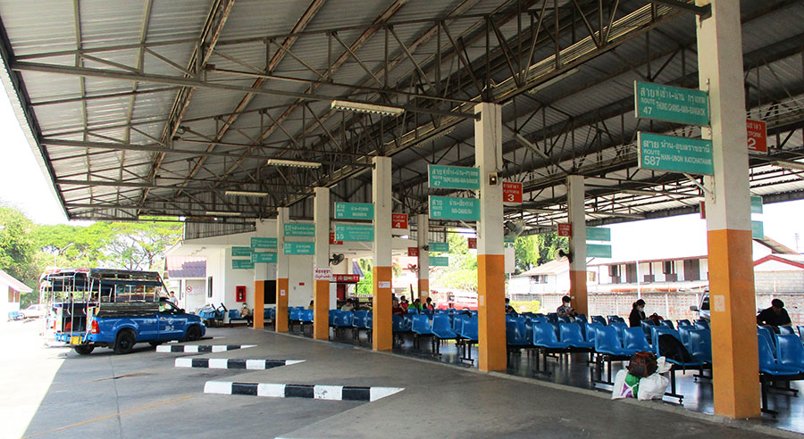The main bus station in Nan is located at grid code JF174 on THIS MAP and is a bit too far for walking to most accommodation from the bus station. Most signs at the bus station are only in Thai and few workers there speak English. There is an Info desk at the bus station with English-speaking help but is not always open or staffed.