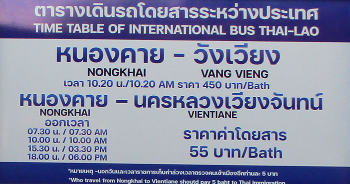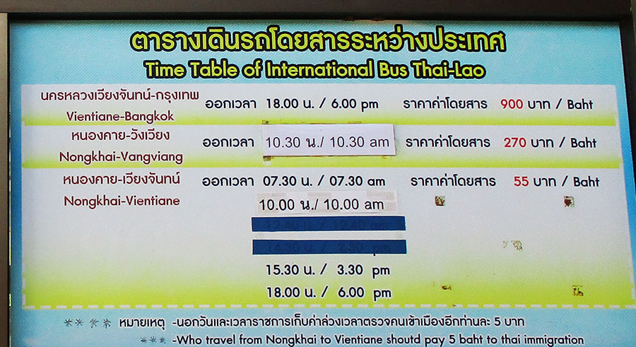 International buses go from Nong Khai to Vientiane and Vang Vieng in Laos - you may need to have a Laos visa to take this bus as they don't want to wait at the border for passengers to get visas. Schedule in January 2023 below shows buses depart from Nong Khai main bus terminal to Vientiane at 07:30, 10:00, 15:30 & 18:00. The Nong Khai to Vang Vieng bus at 10:30 starts its trip from Udon Thani at 08:30.