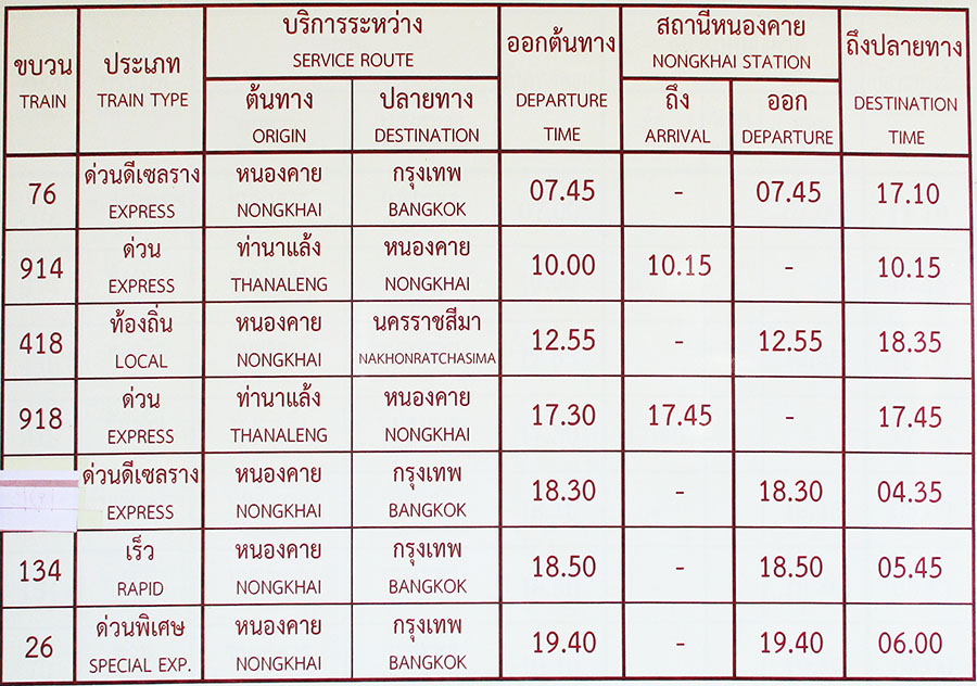- Nong Khai is the end of the line for the Thailand Northeastern railway line as well as the starting point for the quick train trip across the Mekong a short distance into Laos. The train station is located at LZ316 on THIS MAP. Sleeper compartments are usually booked and sold out well in advance. January 2023 railway departure schedule below: