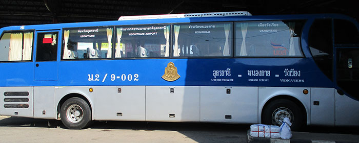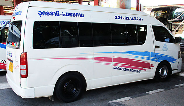 There are frequent white minivan buses going to Udon Thani for 55 baht leaving every 30 minutes or so when each is full - most go to central Bus Terminal 1 in Udon Thani (for transfer to buses to Bangkok, etc.). These white vans depart from the Nong Khai central bus station as well as from a place about 200 meters from the Thai Immigration building at Friendship Bridge (near the 7-11 store on the left as you walk away and south from immigration).