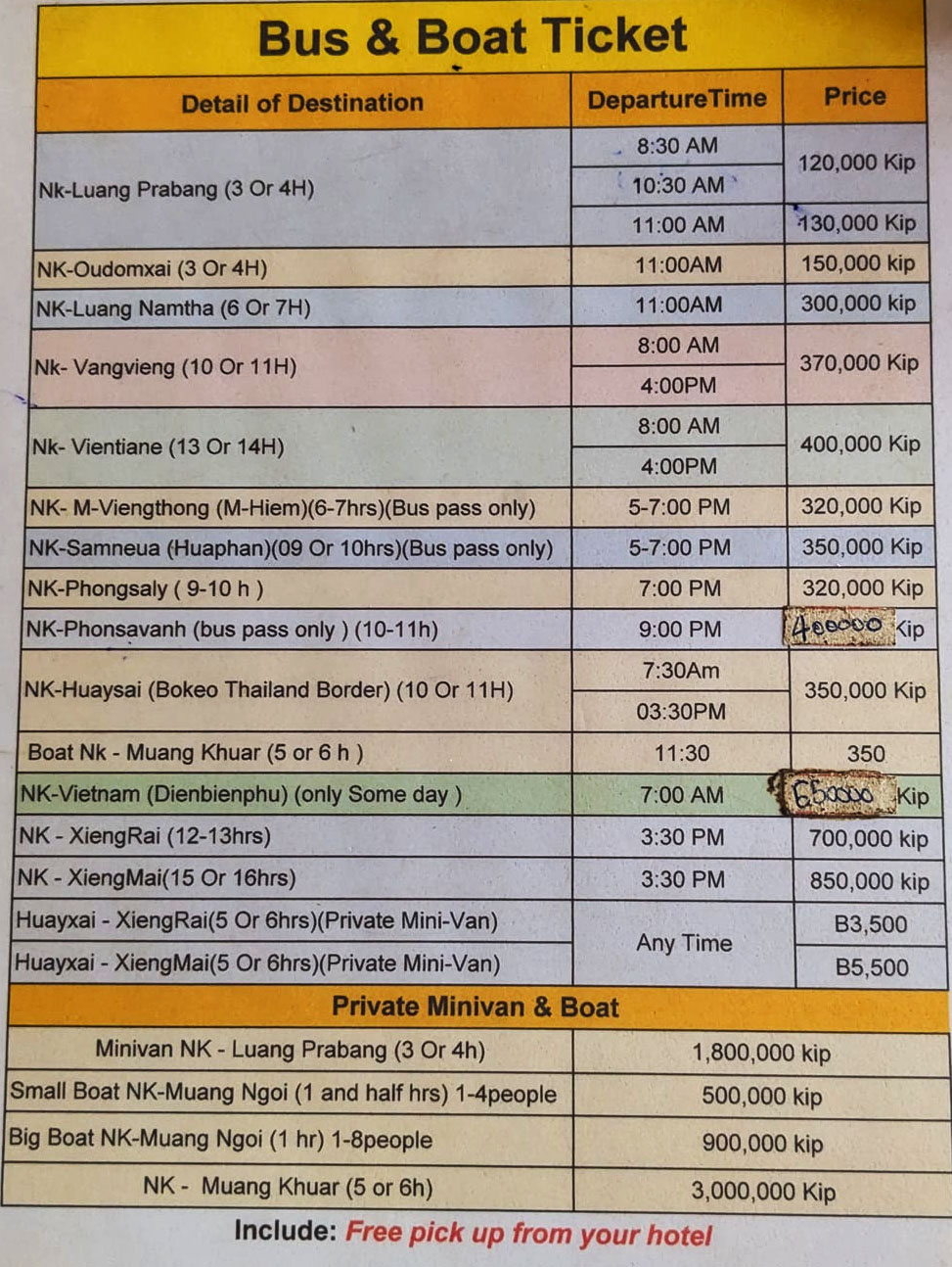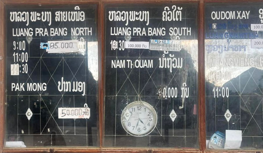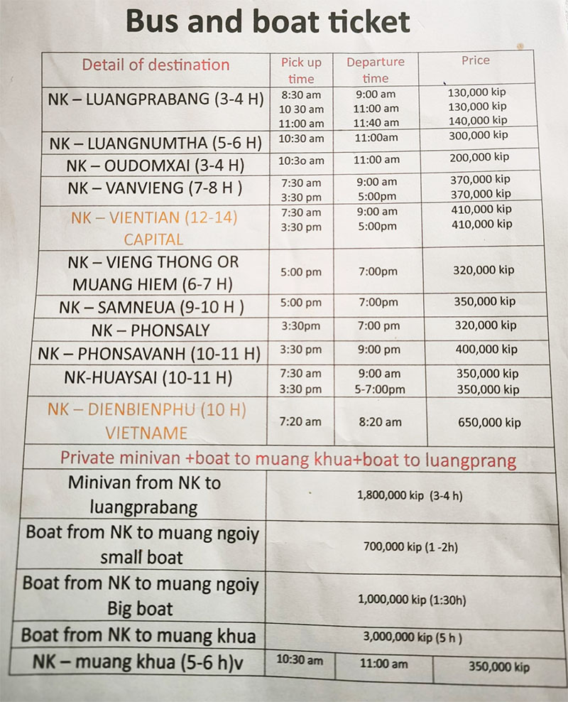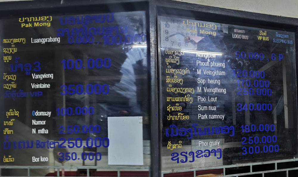 At the upper right side of the image below we can barely see in dark blue a 10:00 AM bus going to Luang Namtha via Oudom Xay but the price seems a bit confusing, maybe 100,000 kip to Oudom Xay and 200,000 to Luang Namtha.