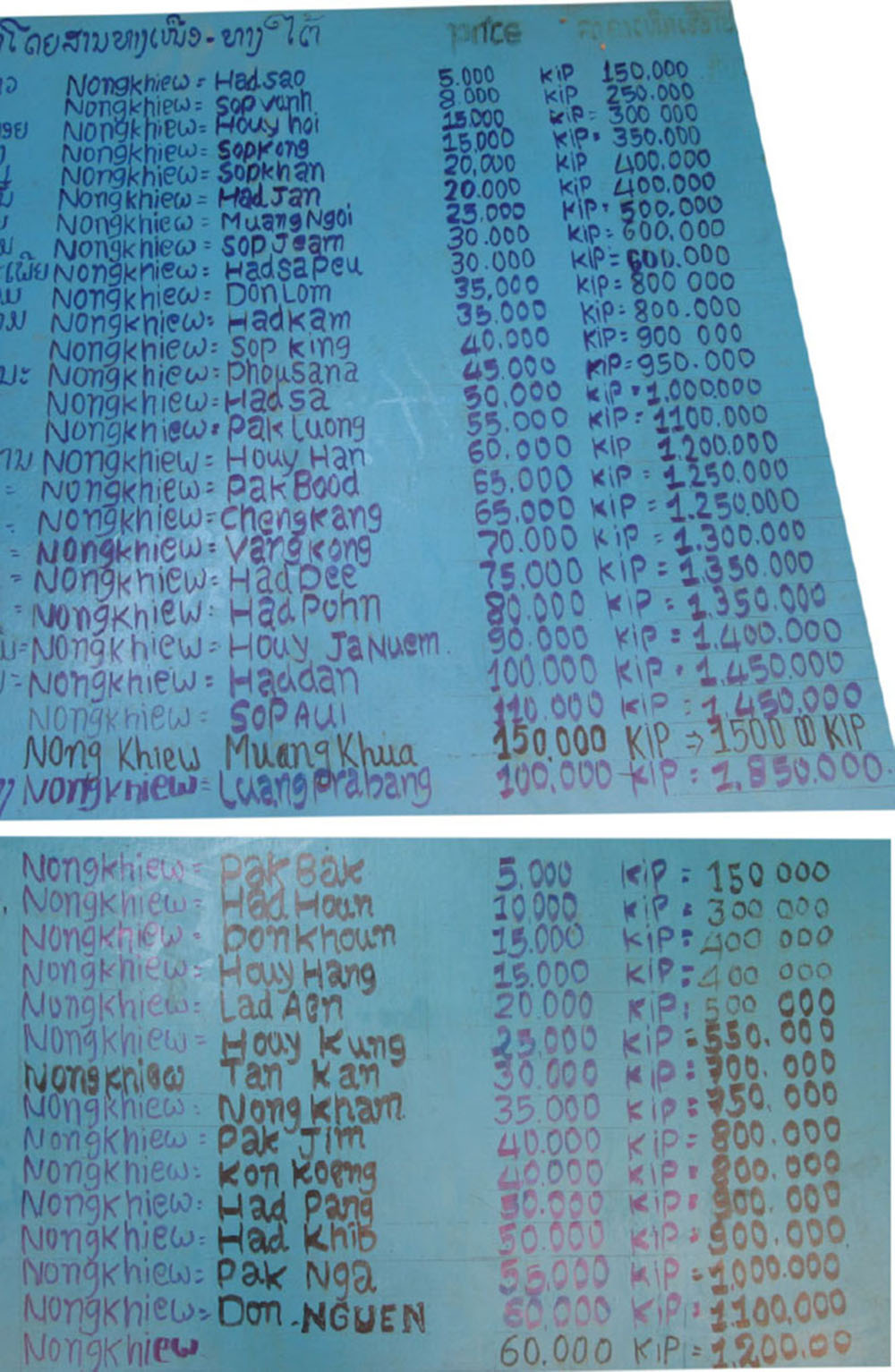 Pak Mong bus station sign below with prices as of Nov. 2024 for those who want to catch buses on the main Highway 13 route at Pak Mong junction about 31 km from Nong Kiew. These buses usually start their daily trips elsewhere and just stop shortly at Pak Mong bus station to pick up passengers. There are no scheduled times in the image below since they vary from day to day.