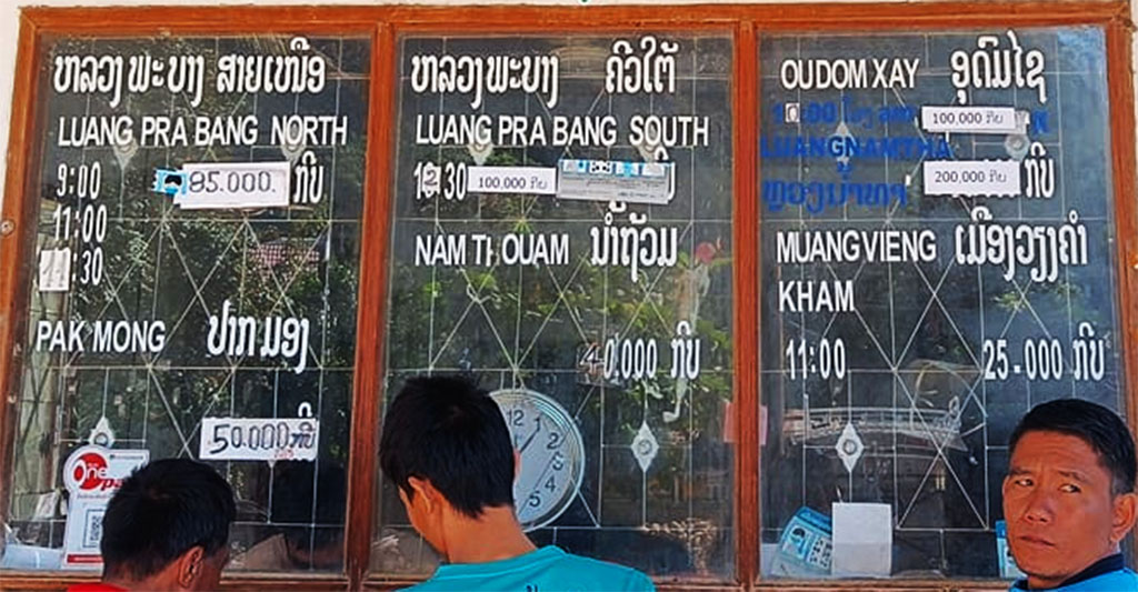 BUS TRANSPORT - Buses often do not always follow the schedule posted at the bus station in the January 2024 picture below. Sometimes no buses go to Luang Namtha & Oudom Xay directly so people have to take a bus to Pak Mong and wait for a bus coming by on the way to Oudom Xay. At Pak Mong you can wait for these buses at the bus station or at the junction of Highway 13 and Highway 1C where there are restaurants. Not all buses stop at the bus station so we recommend waiting at the junction and flag down any bus coming by.