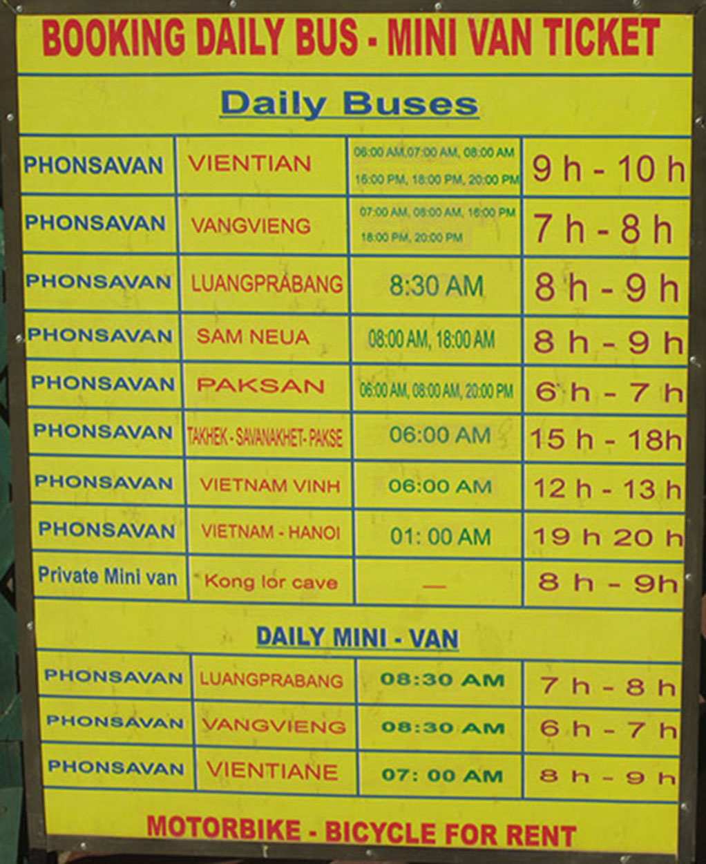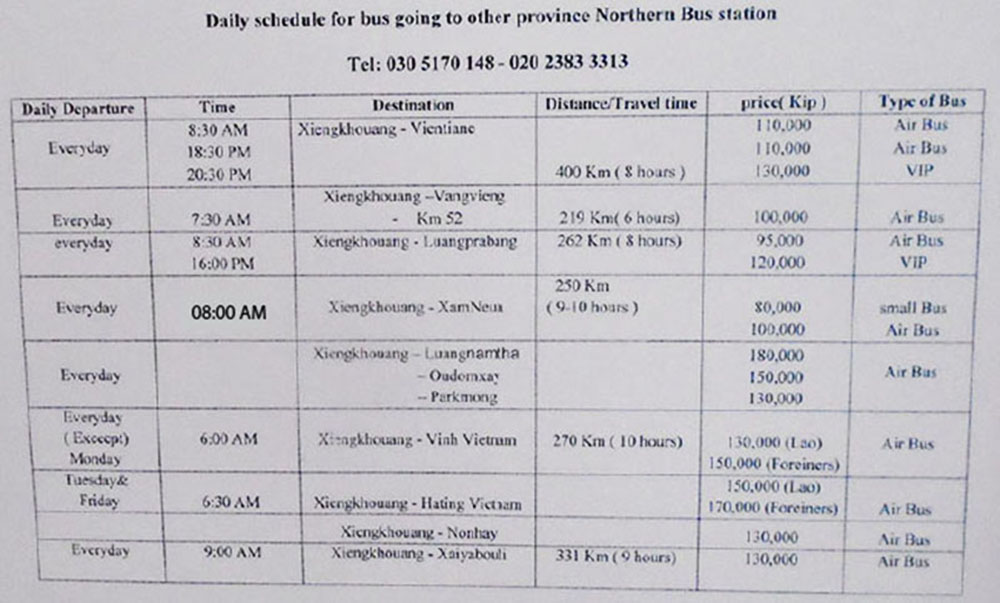 The Xieng Khouang Bus Station (North Bus Station) schedule below was posted at the tourism office June.