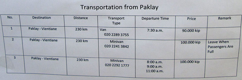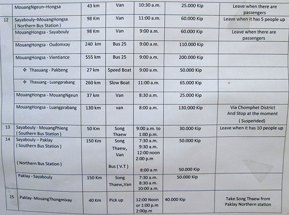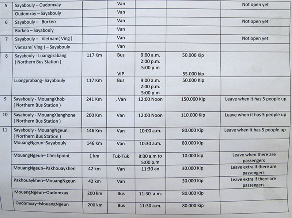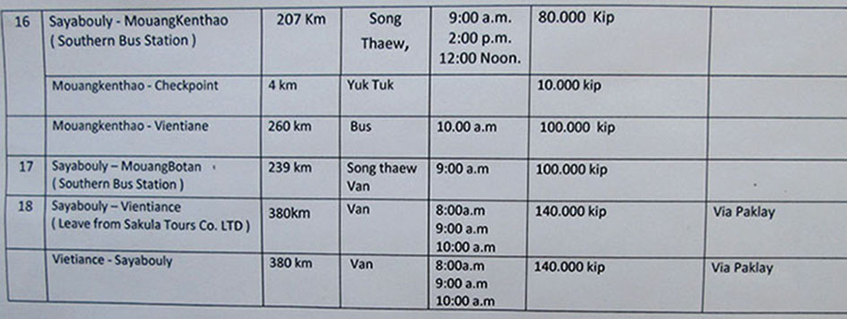 The Sayaboury Tourism Office also has bus schedules for Pak Lay to Vientiane and for Muang Ngeun - the below are from March 2017
