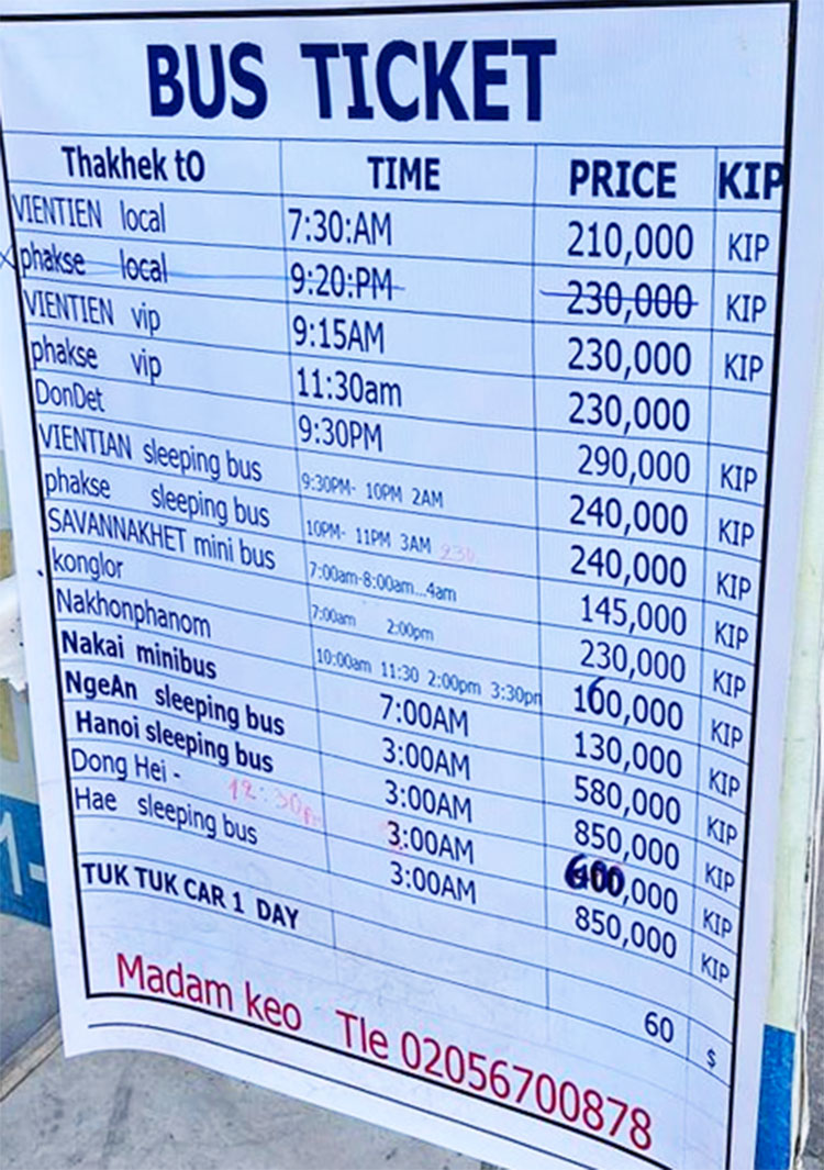 Bus schedules below from Thakhek Tourism Office March 2020 - but they look like older versions and can't be relied on