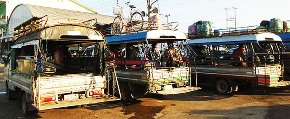Public bus transport around the Thakhek Loop is mostly by songtaew-style small buses that can carry passengers and bicycles.