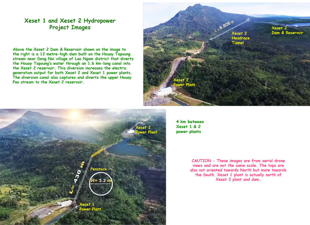 Xeset 1 & 2 Hydropower Projects are connected and share the same flow of water in part coming from the diversion of water from the Houay Tapuong and other streams. These diversions pass thru the Xeset 2 powerhouse and then the Xeset 1 powerhouse generating electricity twice as shown in the image below.